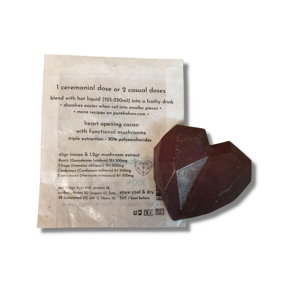Omarm de warmte van het seizoen met ons 100% pure cacao hart uit Nicaragua. Gemaakt van de fijnste cacaobonen, is deze ceremoniele lekkernij ontworpen om het hart te openen en de geest te verheffen. Rijk aan antioxidanten en stemmingsverbeterende eigenschappen, is het de perfecte manier om te ontspannen en in het moment te blijven. Verrijkt met verschillende medicinale paddenstoelen.
